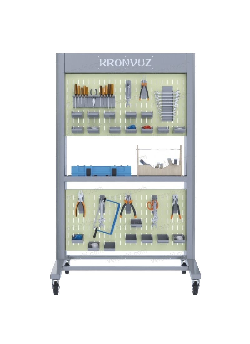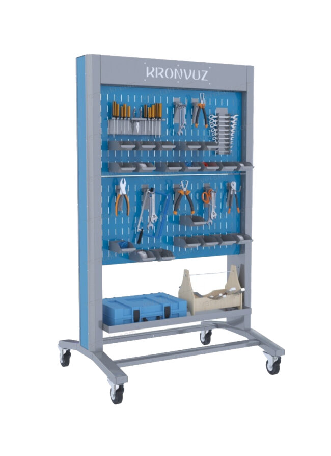 Передвижная инструментальная стойка KronVuz Rack 2012 разрабатывалась конструкторским отделом с учетом прочности, надежности, увеличенной площади для хранения инструмента, приспособлений и приборов. Позволяет быстро и удобно перемещать стойку к месту ремонта. На изделие можно добавлять различные дополнительные элементы – лотки, полки, держатели, также есть возможность установки инструментальной тумбы с ящиками различной вместимости.