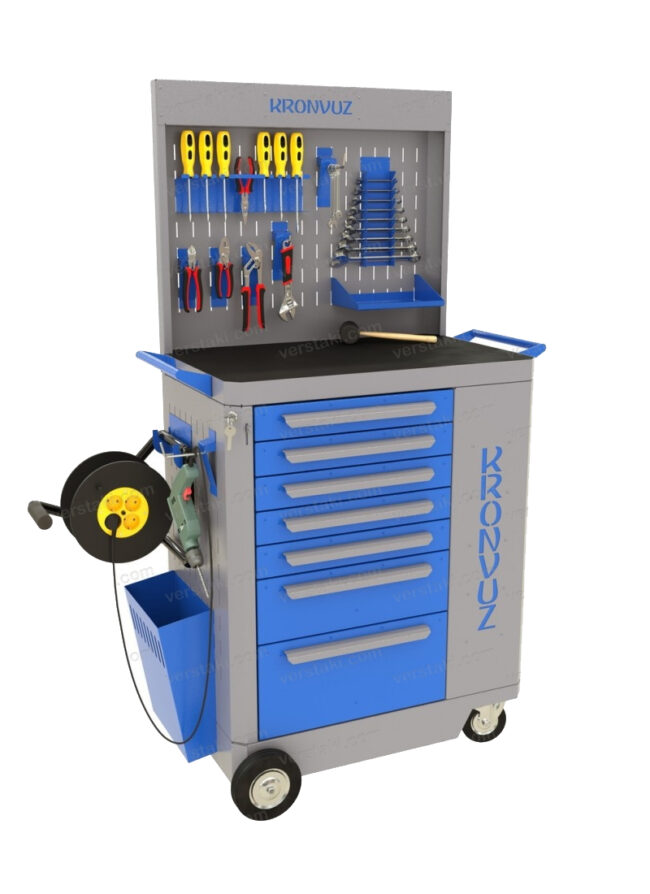 Инструментальная тележка электромонтажника с резиновым ковриком KronVuz TB 700-S удобна при осуществлении монтажа, сборке щитков учета, проверке и ремонте производственного оборудования.