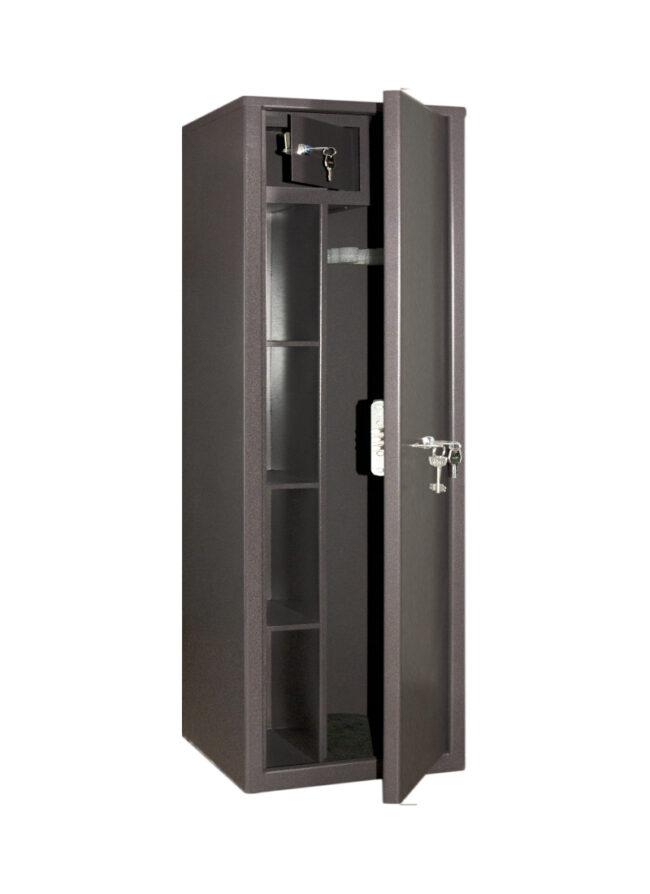 Оружейные шкафы производства завода «ЭКОМ» удовлетворяют требованиям МВД РБ, предъявляемым к хранению огнестрельного оружия. Сейфы для оружия серии РШЛ комплектуются двумя замками: ригельным АО САМ (Россия) и блокирующим EURO LOCKS. Цельногнутая конструкция корпуса и двери. Монтажные отверстия для крепления шкафа в стену. Скрытые петли.