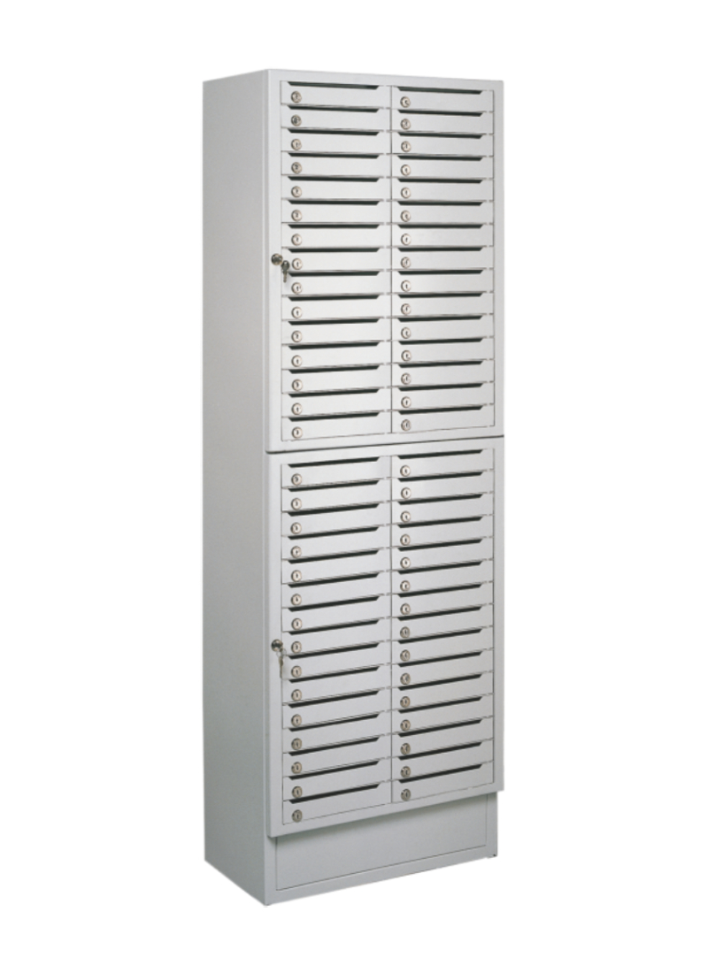 Наличие общей двери для закладки корреспонденции в верхней и нижней половине шкафа, гладкое матовое покрытие светло-серого цвета (RAL 7035).