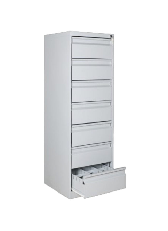 Шкаф картотечный ТК 7/1 (А6) имеет жестко-сварную конструкцию, размеры 1385х525х535 мм (ВхШхГ), 7 выдвижных ящика на телескопических направляющих, нагрузка на ящик до 25 кг. Дно каждого ящика имеет специальную перфорацию для установки перегородок под формат А6. Каждый ящик формата А6 комплектуется 2-мя продольными и 3-мя поперечными перегородками