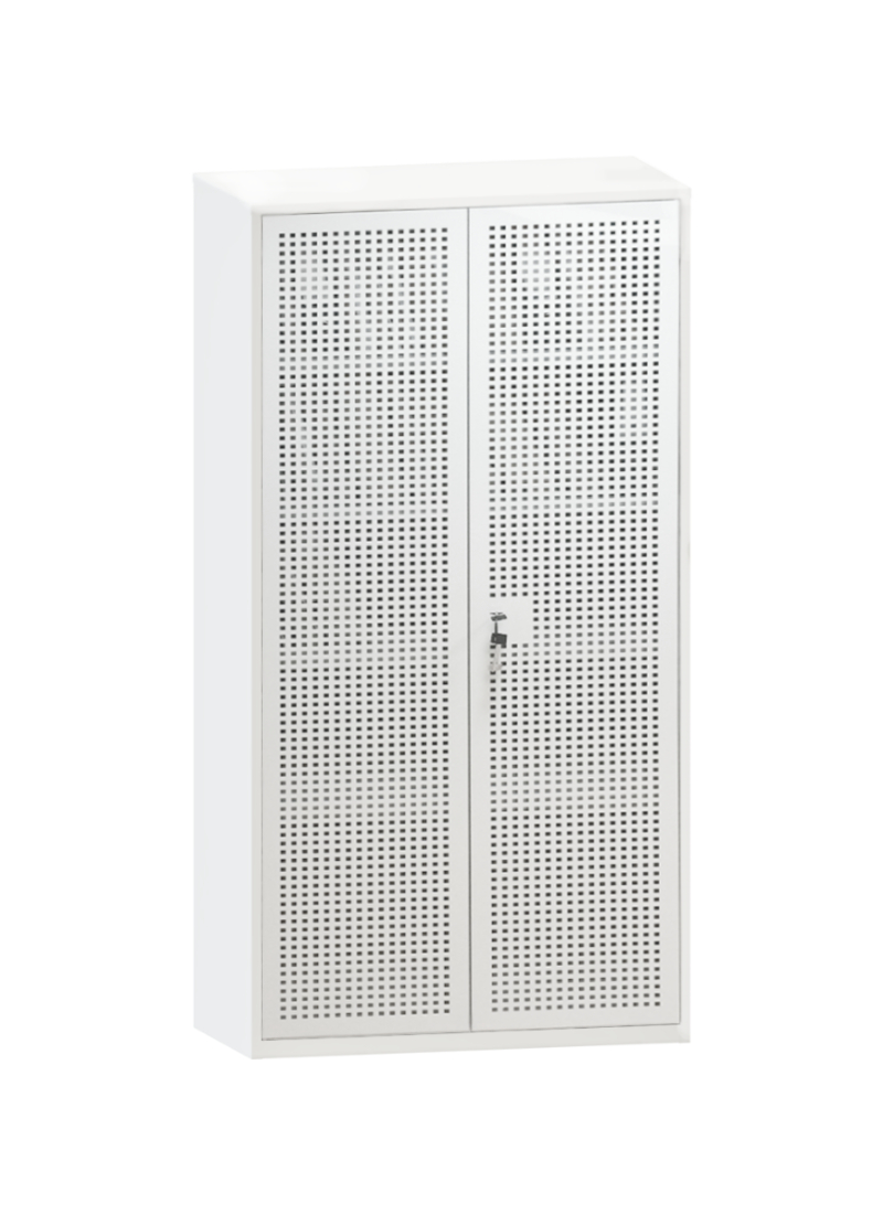 Шкаф металлический БШС 2 имеет жестко-сварную конструкцию, размеры: 1900х1000х500 мм (ВхШхГ), 4 регулируемые по высоте полка с шагом 50 мм, распределенная нагрузка на полку до 100 кг. двери имеют перфорированную конструкцию.