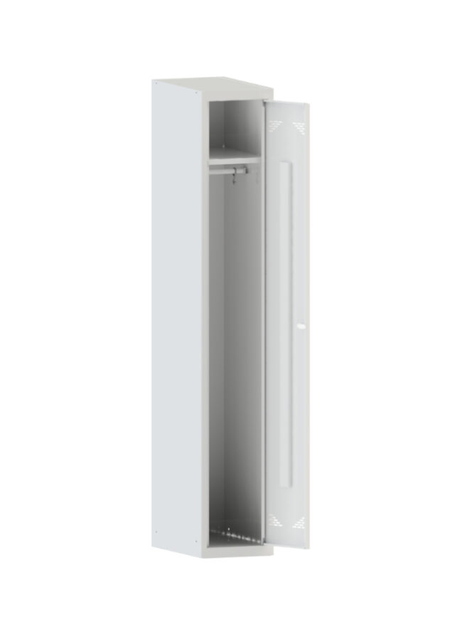Шкаф металлический ШО 1 имеет жестко-сварную конструкцию, размеры: 1800х300х500 мм (ВхШхГ), полка для головных уборов, перекладина для вешалок и 2 крючка для одежды.