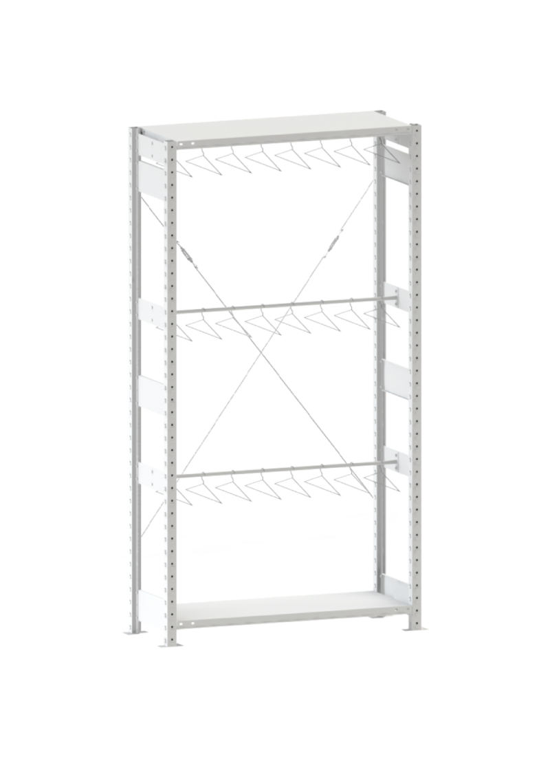 Стеллаж для одежды серии САМус имеет надежную сборно – разборную конструкцию, состоящую из стоек САМус (включающую поперечные стяжки, подпятники) и полок.