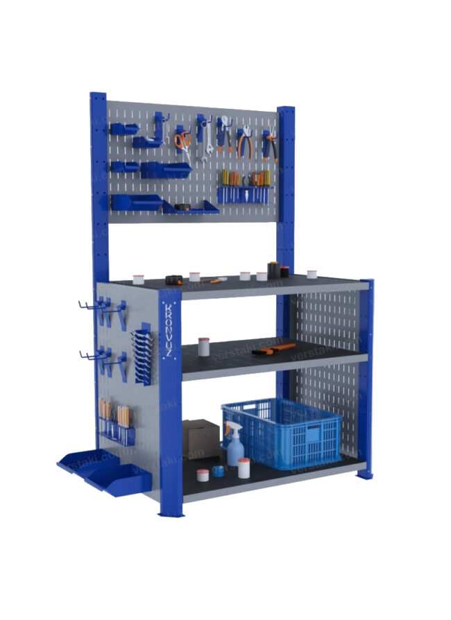 Стеллаж металлический для автослесаря KronVuz CT H3 12Х19(10)-S1-2SB1 представляет собой двухуровневую конструкцию с двумя 1900 мм стойками под перфорированный экран и двумя 1000 мм стойками, благодаря чему верхняя металлическая полка может использоваться в качестве столешницы.