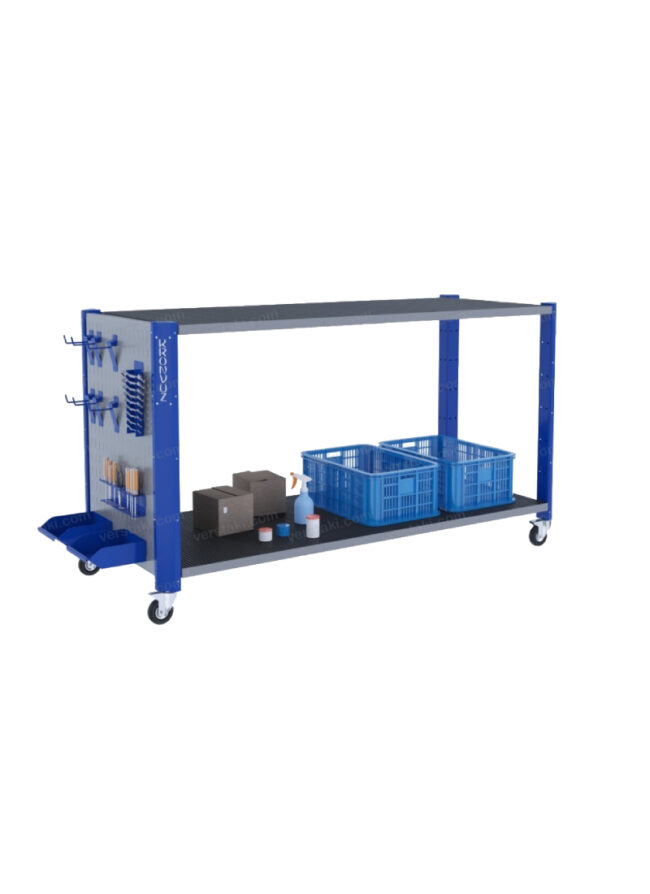 Благодаря этому стеллаж выдерживает распределенную нагрузку до 4500 кг, может использоваться в качестве стола производственного и тележки для транспортировки объемных деталей и тяжелого оборудования.